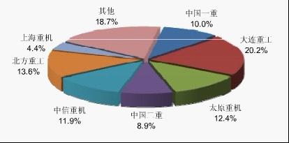 目前国内冶金设备制造商仍然以国有企业为主,产业集中度较高,大连重工·起重集团、中国一重、中国二重、太原重工等几家大企业占据了国内三分之一的市场份额。此外,德国西马克集团、西门子奥钢联、意大利达涅利集团3大国际冶金设备公司仍然在中国冶金设备市特别是高端市场占有较大的份额。