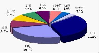 我国冶金设备的出口市场主要集中在亚洲和欧美一些国家和地区。印度是我国冶金设备较大的出口目的地,占该行业出口额的比重为26.41%,2009年,出口国的数量比上年度略有增加,说明我国冶金设备的出口市场在不断的拓宽。
