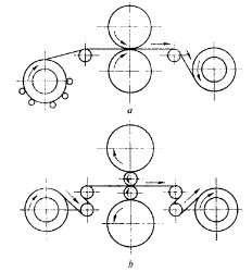 单机不可逆式冷轧机主要有二辊轧机和四辊轧机两种(下图),这种冷轧机在我国有数百台之多,其辊身长度在100-600mm之间,辊径在100-300mm之间。在这些轧机中,大部分设有开卷机和卷取机。这些轧机主要用来生产600mm以下的窄带钢或平整成卷的窄带钢,轧制速度在1.2-2.0m/s范围内。