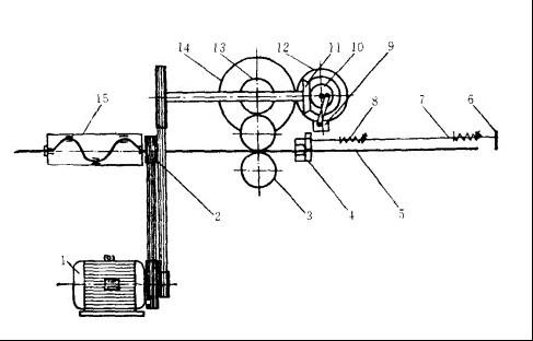 1-电动机;2-皮带轮;3-牵引辊;4-滑动刀台;5-调直钢筋;