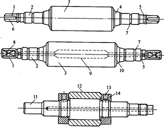 根据冷轧机轧辊的结构图,我们从中可观察出,轧辊一由14个部件构成,分别是1-传动端;2-辊颈;3-辊身;4-圆锥过渡区;5-紧固件槽;6-键槽;7-辊颈润滑油沟;8-平口;9-内孔;lO-双圆锥过渡区;11-心轴;12-硬质合金套;13-螺钉;14-轴向紧定用螺母等构成。