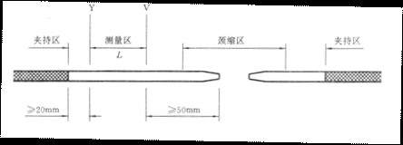 选择Y和V两个标记,这两个标记之间的距离在拉伸试验之前至少应为100mm。两个标记都应当位于夹具离断裂点较远的一侧。两个标记离开夹具的距离都应不小于20mm;两个标记与断裂点之间的距离应不小于50mm。