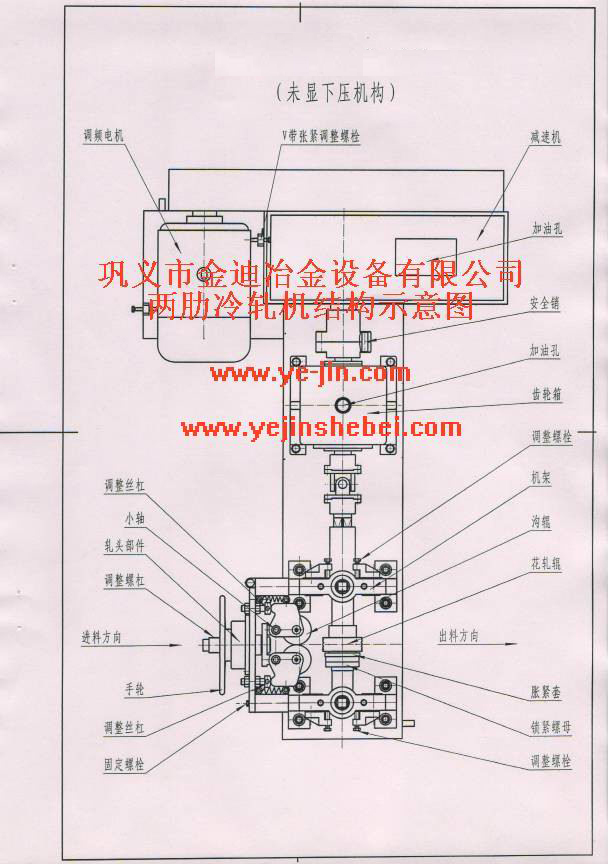 金迪两肋冷轧机的结构由调整电机、调整丝杠、小轴、轧头部件、调整螺杠、进料口、手轮、调整丝杠、固定螺栓、减速机、加油孔、*销、加油孔、齿轮箱、调整螺栓、机架、沟辊、花轧辊、出料口、胀紧套、锁紧螺母、调整螺栓等部件构成。