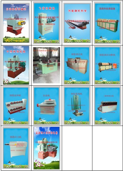 巩义市金迪冶金设备有限公司生产的钢筋加工机械、钢筋加工冷轧设备有:全自动钢筋弯箍机、钢筋除锈减径机、飞剪切断机、钢筋翻转料架、高频热处理设备、中型两肋冷轧机、工字轮收线机、钢筋调直机、钢筋调直切断机、钢筋除锈机、拉盘机、热轧收线机、三级钢调直机、钢筋应力机、小型两肋冷轧机等机器设备。